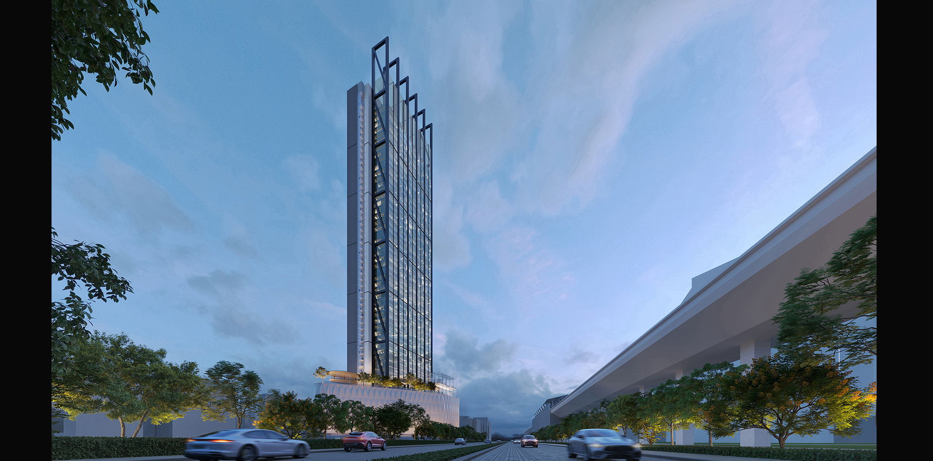 This is a 222m high tour de force tower comprising of 2 basements, 10 car parking podium floors, located above the podium is the main 3 storey 11m high main arrival lobby with a very powerful statement including outdoor space and 45 office floors. The layout has a split side cores with main office spaces facing the expressway.