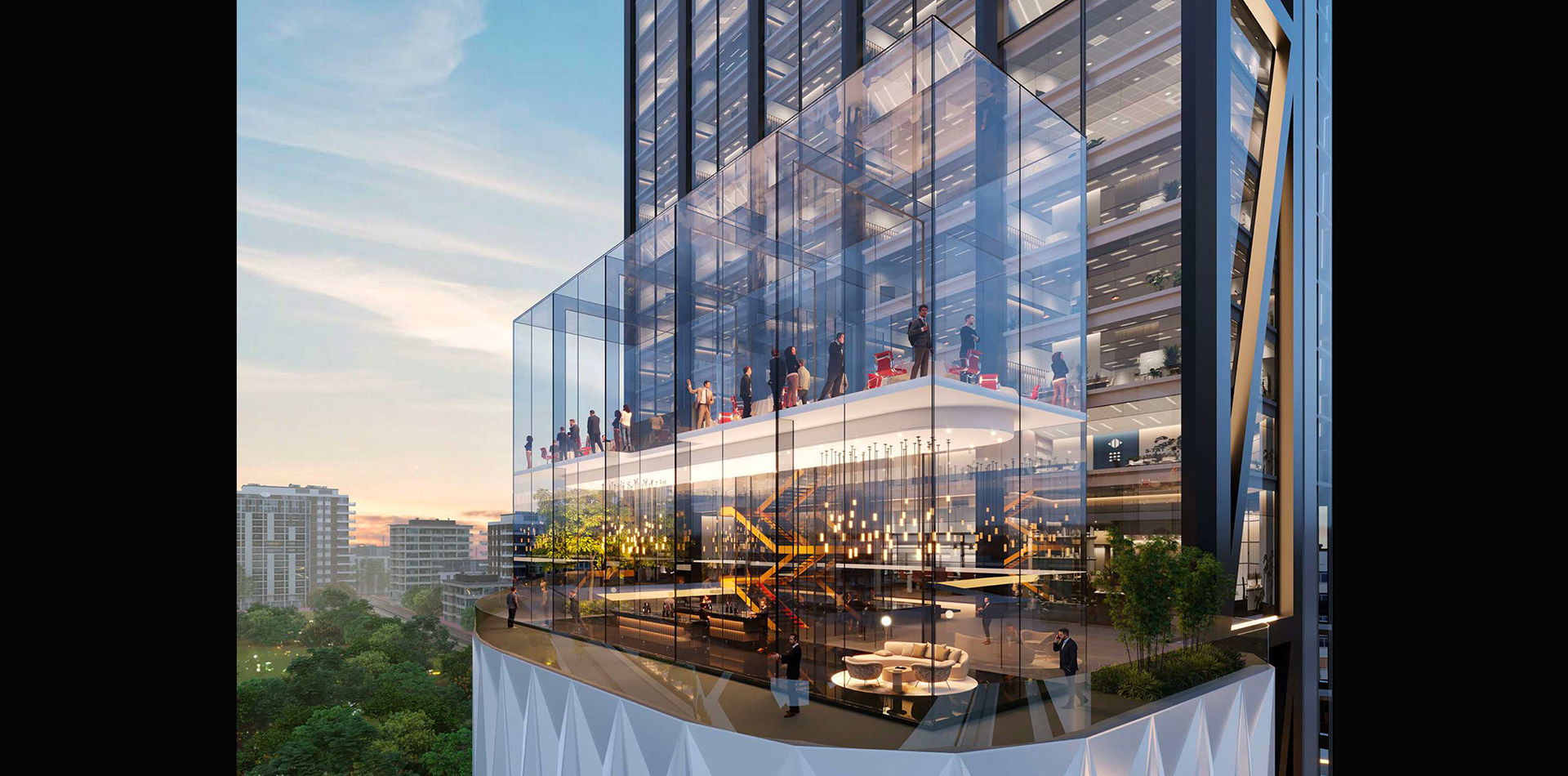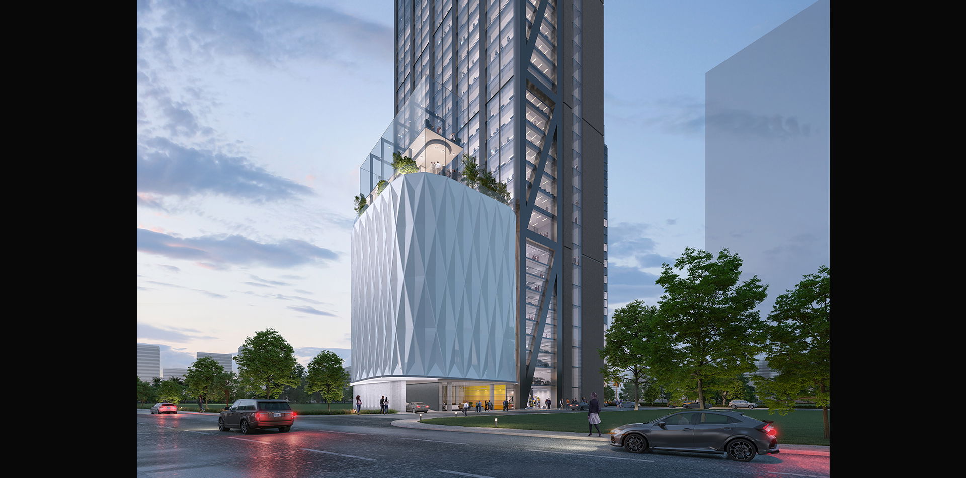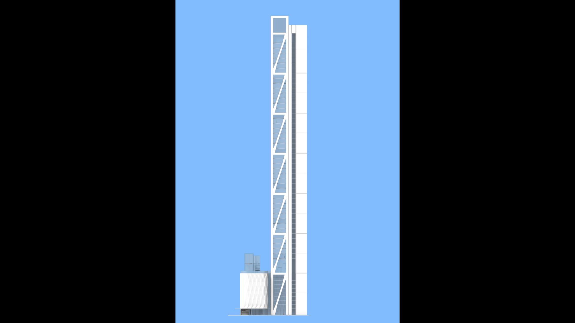 This is a 222m high tour de force tower comprising of 2 basements, 10 car parking podium floors, located above the podium is the main 3 storey 11m high main arrival lobby with a very powerful statement including outdoor space and 45 office floors. The layout has a split side cores with main office spaces facing the expressway.